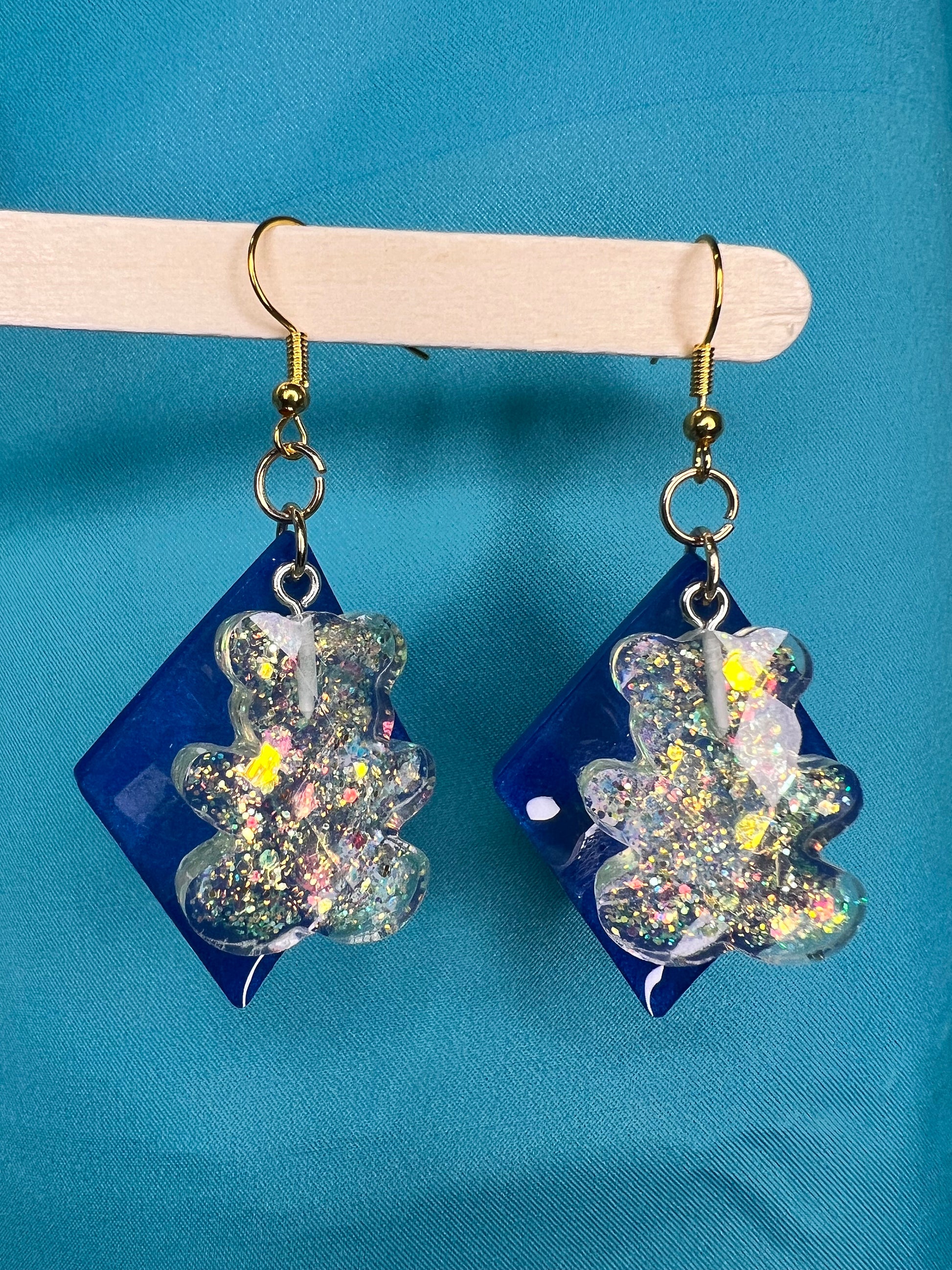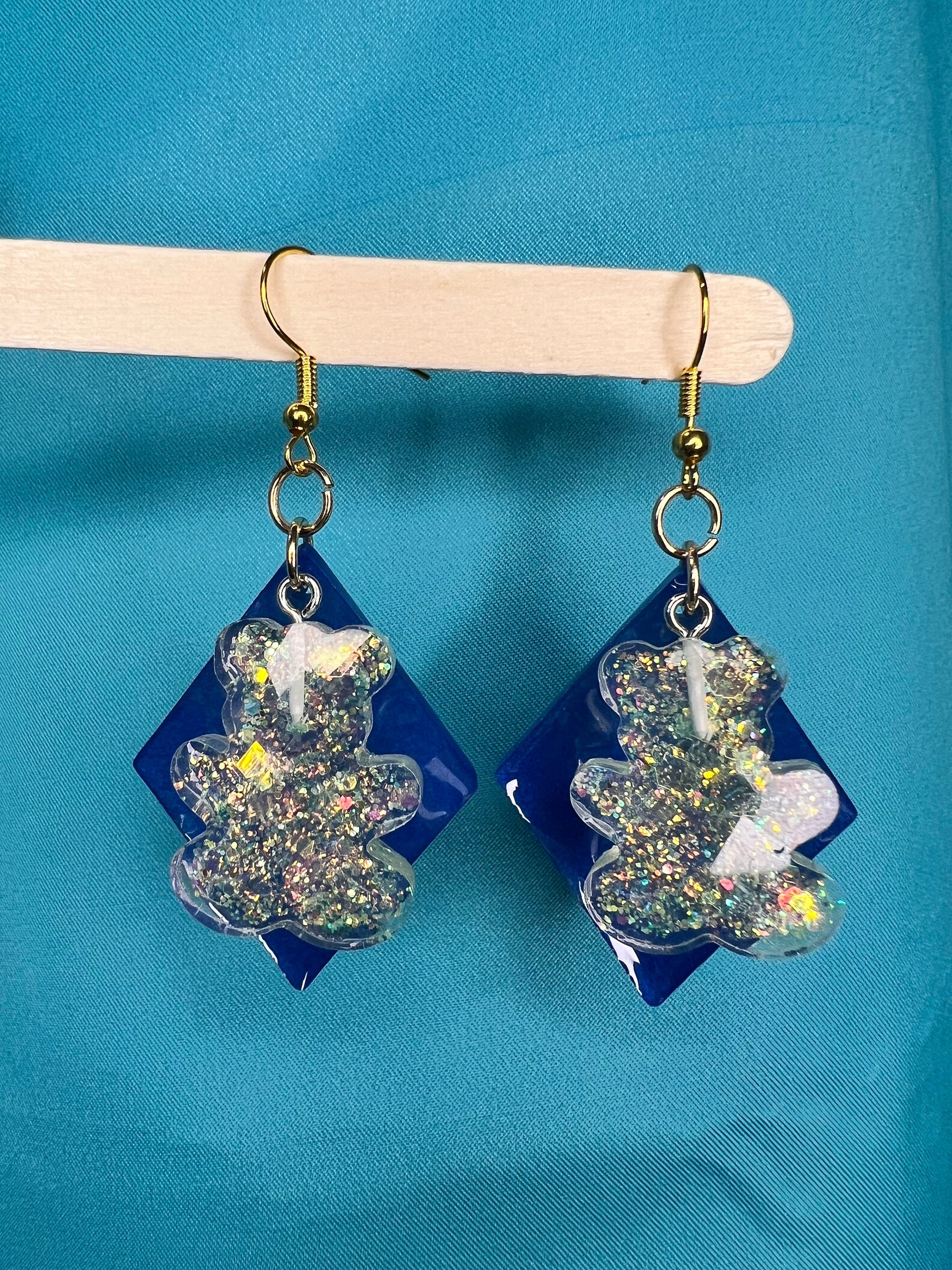 yellow and white gummy bear charms adorn this set of blue sparkle teardrop earrings.