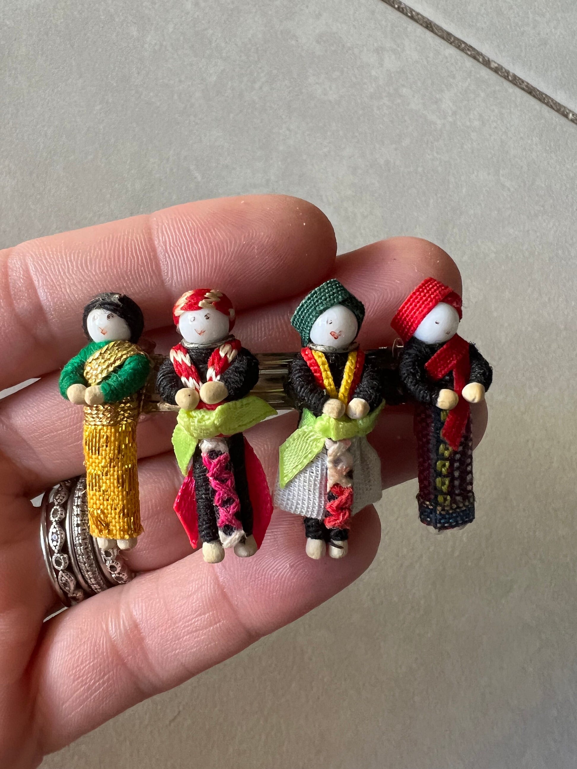 Hand made hair clips with little indigenous people with cloth clothing tiny child novelty hair clip vintage