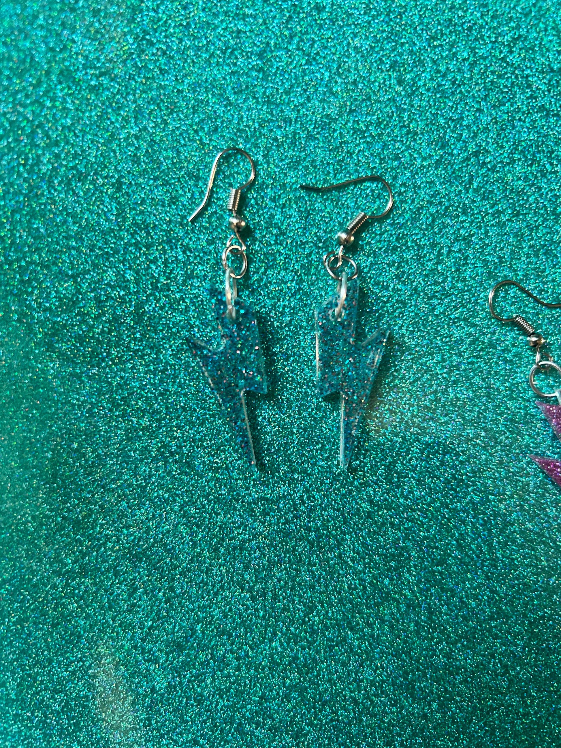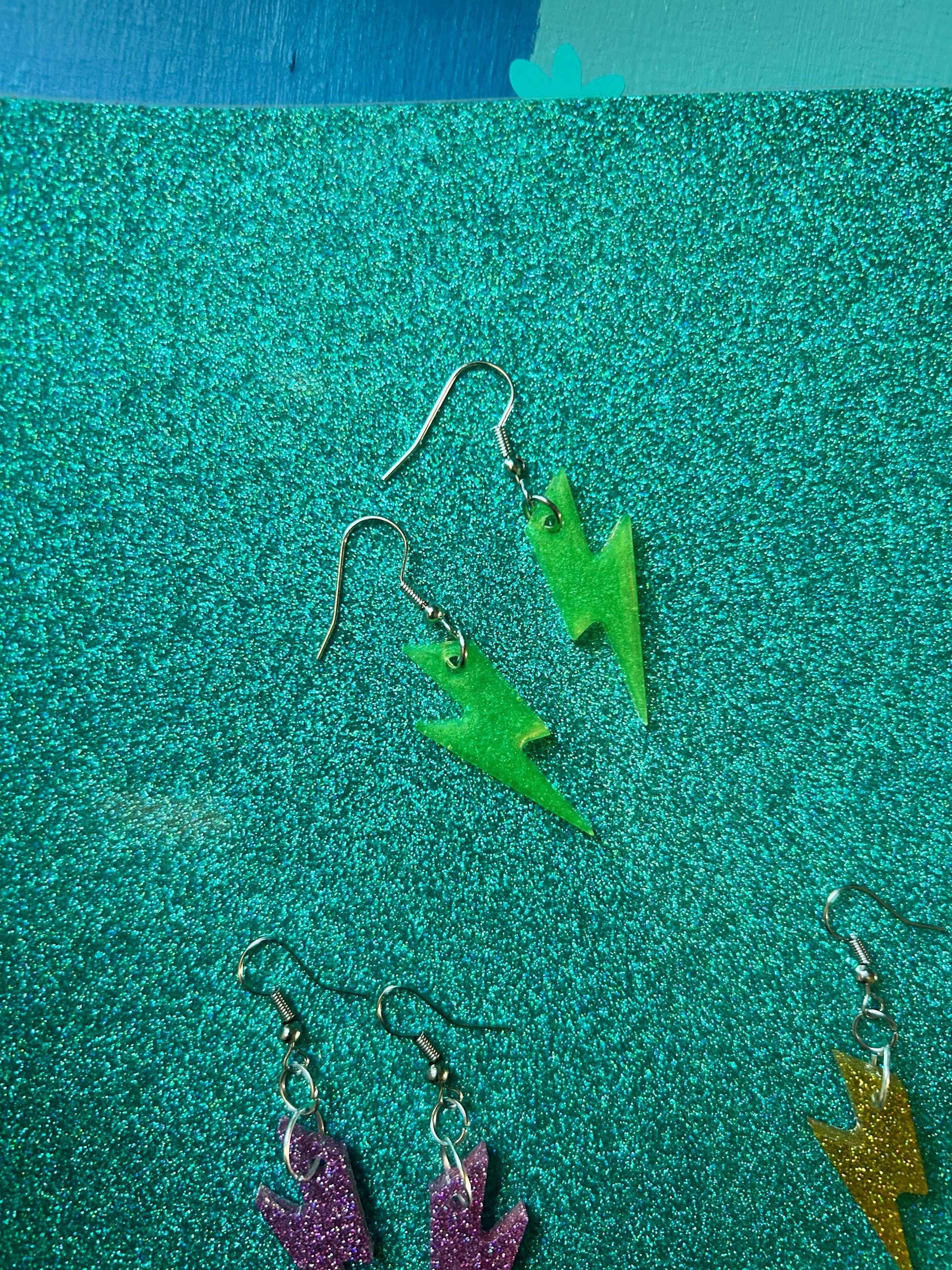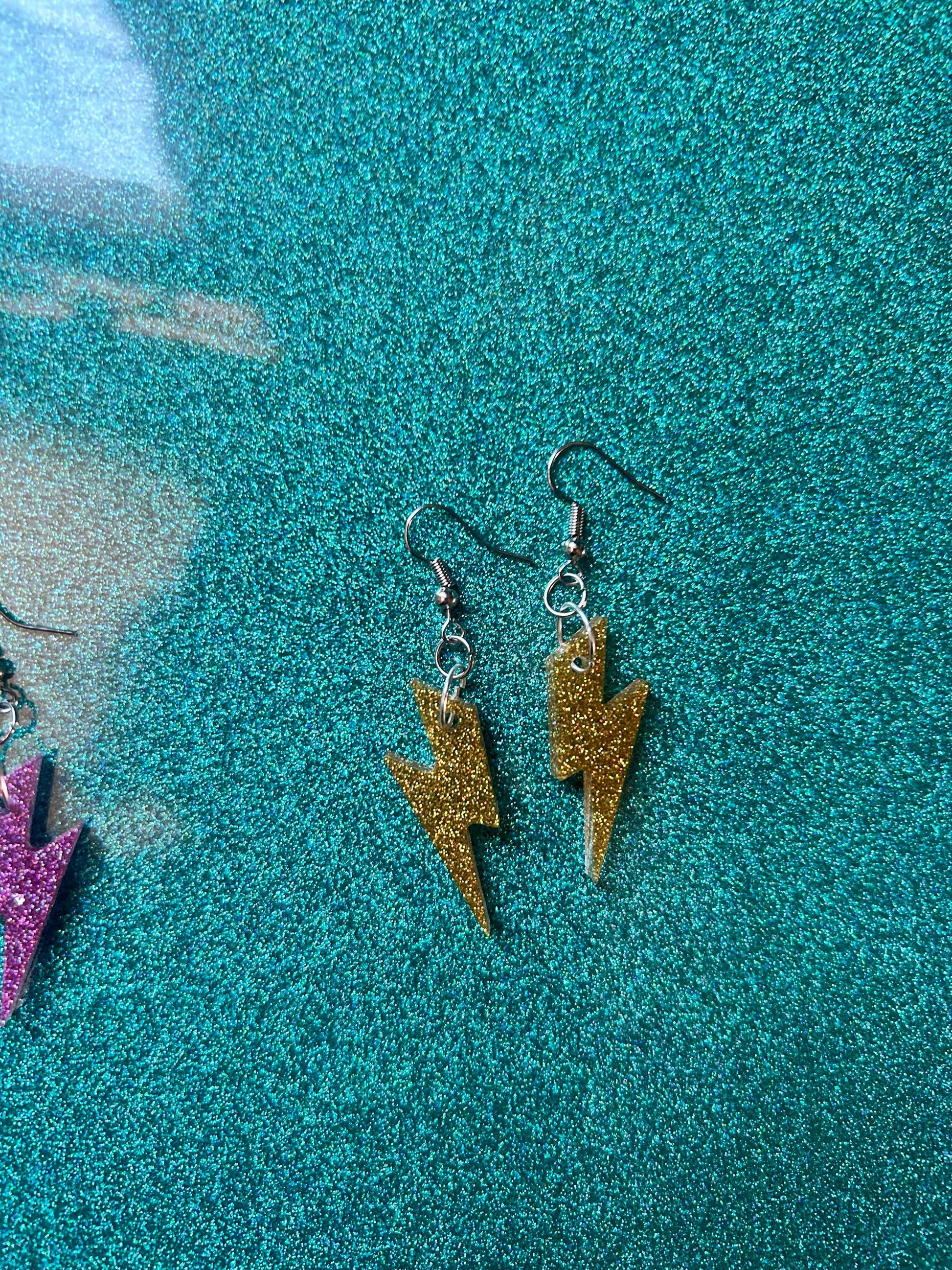 Be bold with our one-of-a-kind handmade long dangle earrings featuring glittery olive gold green or peach colored lightning bolts. Featuring striking 2-inch long designs, they make a beautiful statement and are perfect for any occasion. With their classic gold accents, they will be sure to make you feel beautiful.