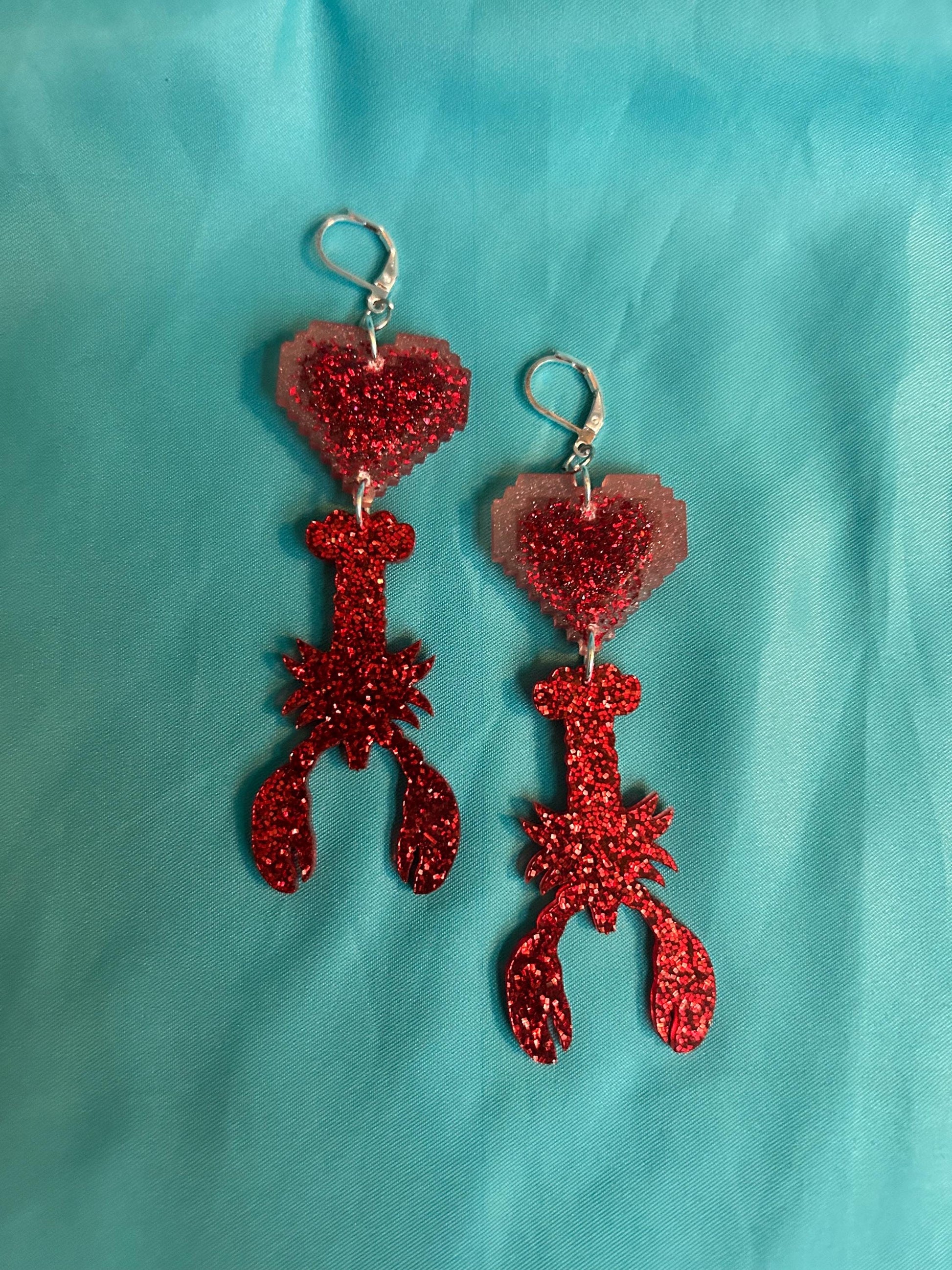 These gorgeous handmade earrings feature a unique design. Crafted with red hearts, adorned with acrylic sardines, these 3-inch long statement makers will bring a unique flair to any outfit. Perfect for the fashion-forward individual.