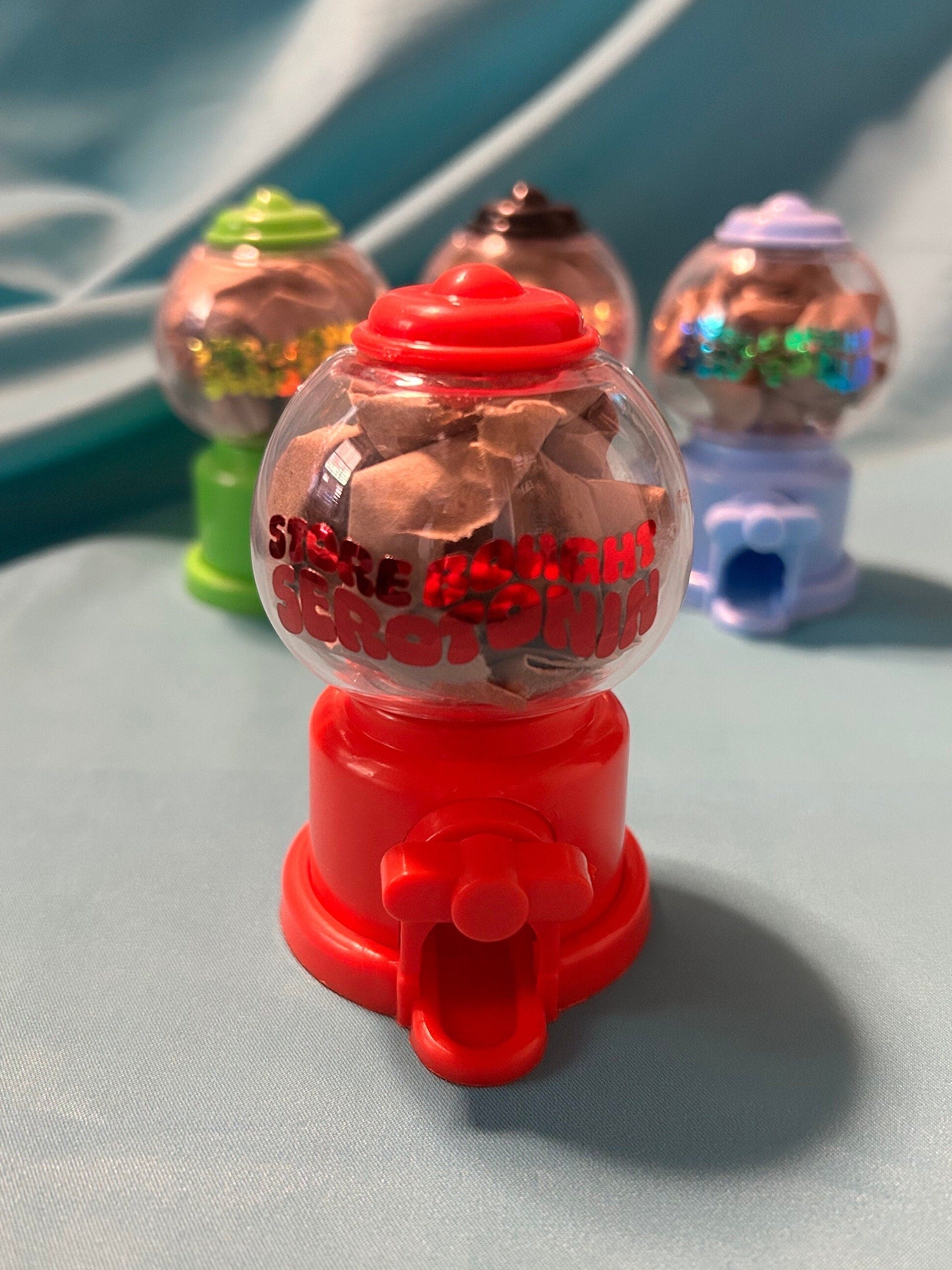 Cute way to take your daily dose of awesome! Plastic candy or pill or supplement dispenser and plastic bubble top with “Store bought serotonin” decal in matching holographic color. Just turn the knob and your pill pops out into the tray. you choose dispenser color!