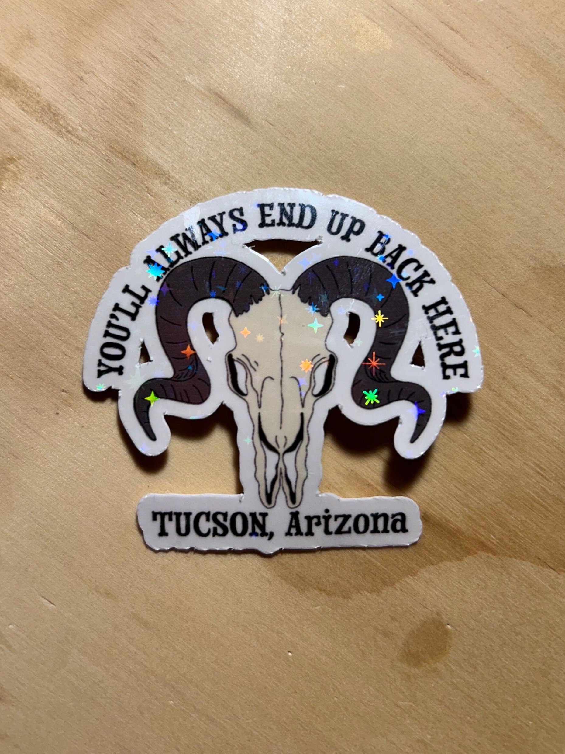you’ll always end up back here skull Tucson sticker holographic hand drawn sticker! Laminated for extra durability, this stickers have a variety of backgrounds and are best on outdoor and indoor items like laptops water bottles or tumblers.