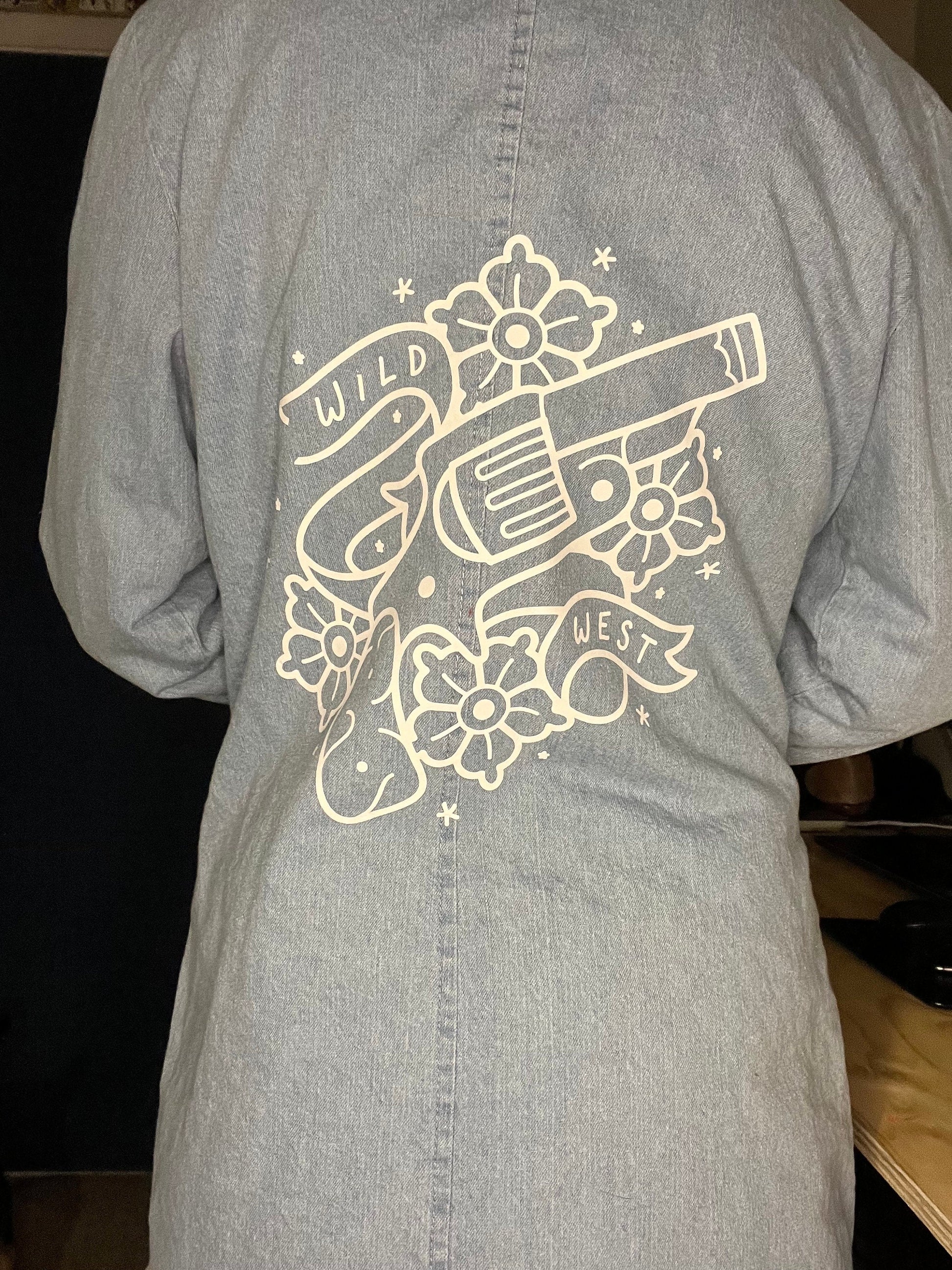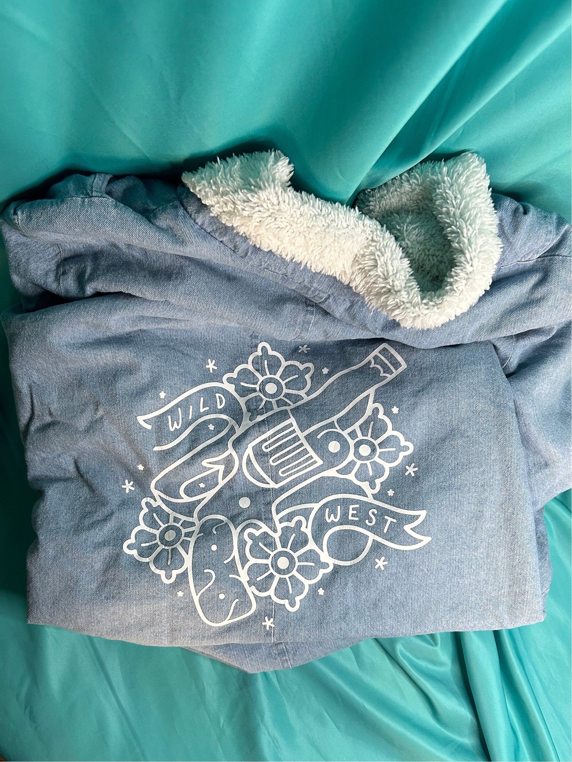Long jacket size large with traditional tattoo design. Wild West with guns. Denim looking outside with white furry soft inside lining. faux pockets. There is a slight design flaw - the banner at the top where "wild" is, is missing - hence the price. See pictures for details.